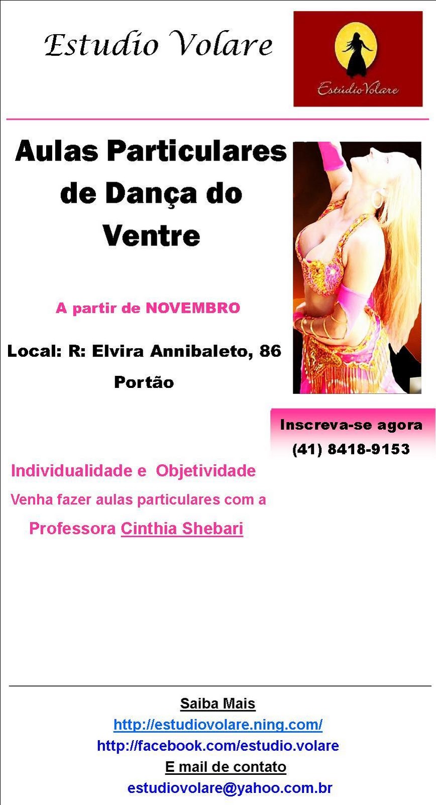 Estou ministrando aulas particulares e pequenos grupos no ÁGUA VERDE , para mais informações é só enviar um e mail para: cinthia@dancadoventrecuritiba.com